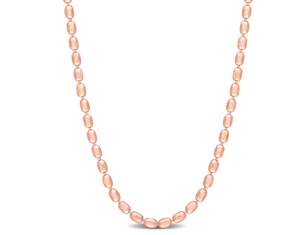 Be stylish when you wear this Oval Diamond Cut Beaded Necklace. Crafted in flickering rose plated sterling silver, it features a dynamic oval diamond cut beaded chain design that is creating a bold look. This necklace measures 16-inch in length and secures with a lobster clasp. Polished to a brilliant shine, this rose gold chain makes the perfect addition to any jewelry collection and is a wonderful gift for your special someone. This glamorous necklace is made in Italy.