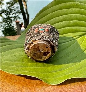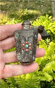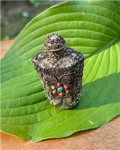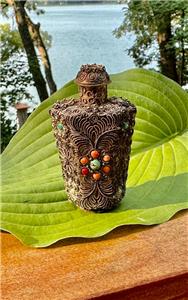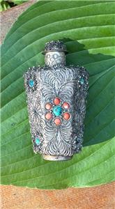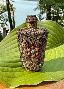 The bottle appears to be missing a turquoise cabochon on the top and on the stopper.