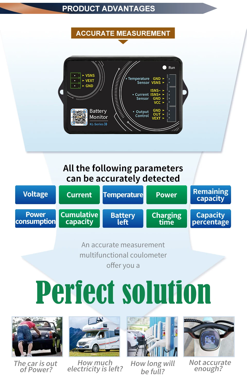 ►The product can accurately measure parameters such as voltage, current, battery capacity, power, power consumption, ambient temperature, battery life, charging time, and battery cumulative capacity.