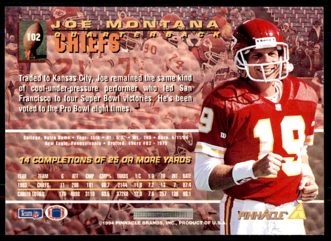 | 1994 Pinnaacle Football Joe Montana NM Kansas City Chiefs 0942 |