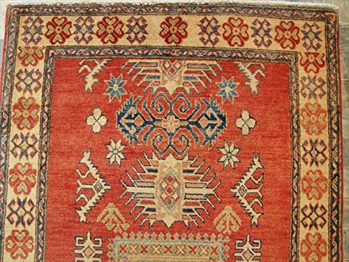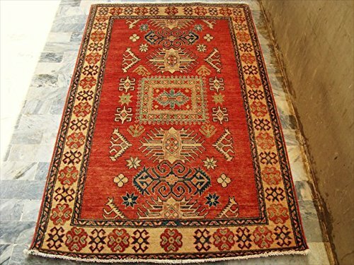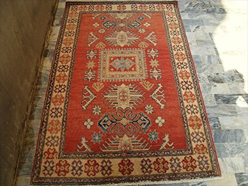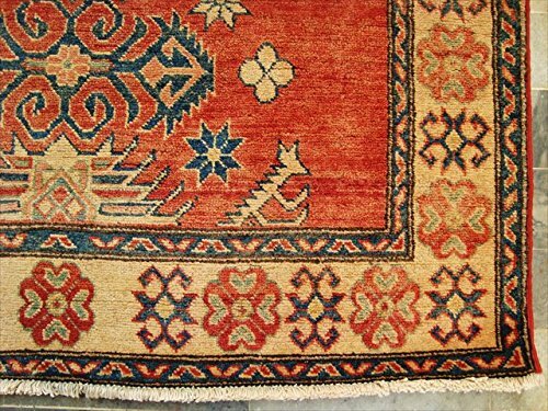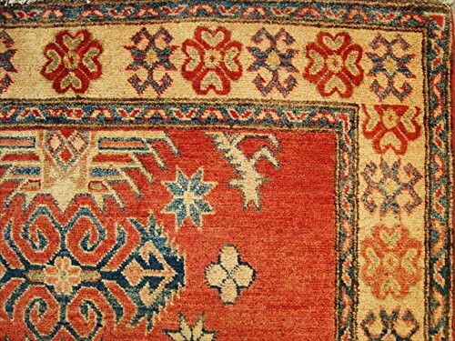Kazak Caucasion Exclusive Designed Vege Dyed Rectangle Area Rug Hand Knotted Carpet (6 x 4)'. Kazak is a modern shape of old Caucasian rugs which strictly adheres to traditional design elements of the Caucasus. It has elements such as the stepped hooked polygons, geometrical medallions and rosettes, presented in more stylized manner and with a new dimension. Natural dyes produce soft luminous shades and abrashes causing a beautiful sheen. Handspun woolen yarn is normally used in the variety of vibrant warm colors. Kazaks rugs in our collection are all fine quality pieces from Afghanistan made with Ghazni handspun wool and natural dyes. It Takes at least 6 months to make a master pcs like this. 100% Genuine Hand Knotted-Rug not hand tufted . Measures approximately 6.1 X 3.10 FT (186 x 118 cm). 100% Genuine Hand Knotted-Rug not hand tufted.