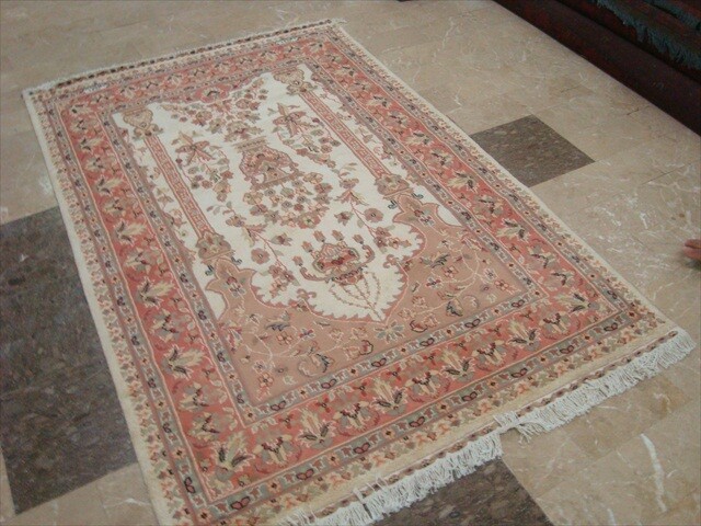 Mehrabe Taj Vaas Guldasta Ivory Hand Knotted Rug Wool Silk Carpet (6 x 4)'. The rug to appear dull when viewed from one side, and shiny from the other side. Please view the picture at the bottom to see the bright side of the rug. This rug can help brighten up a room if you do not get much sunlight. Simply put the bright side facing the seating area and it will make the room appear surprisingly bright. Its soft texture and timeless design makes it ideal to enhance any space where it is placed. This is a 100% Genuine Hand Knotted-Rug not hand tufted like other sellers.