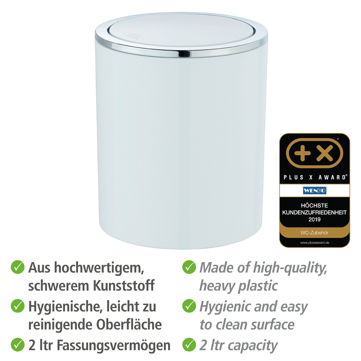 Durch seine glatte Oberfläche ist dieser besonders leicht zu reinigen und dementsprechend hygienisch. Zudem sorgt der Schwingdeckel für leichte Bedienbarkeit und gewährt doch keinen Blick ins Innere. Der Bad-Eimer kann jederzeit am richtigen Ort platziert werden und ist stets griffbereit.