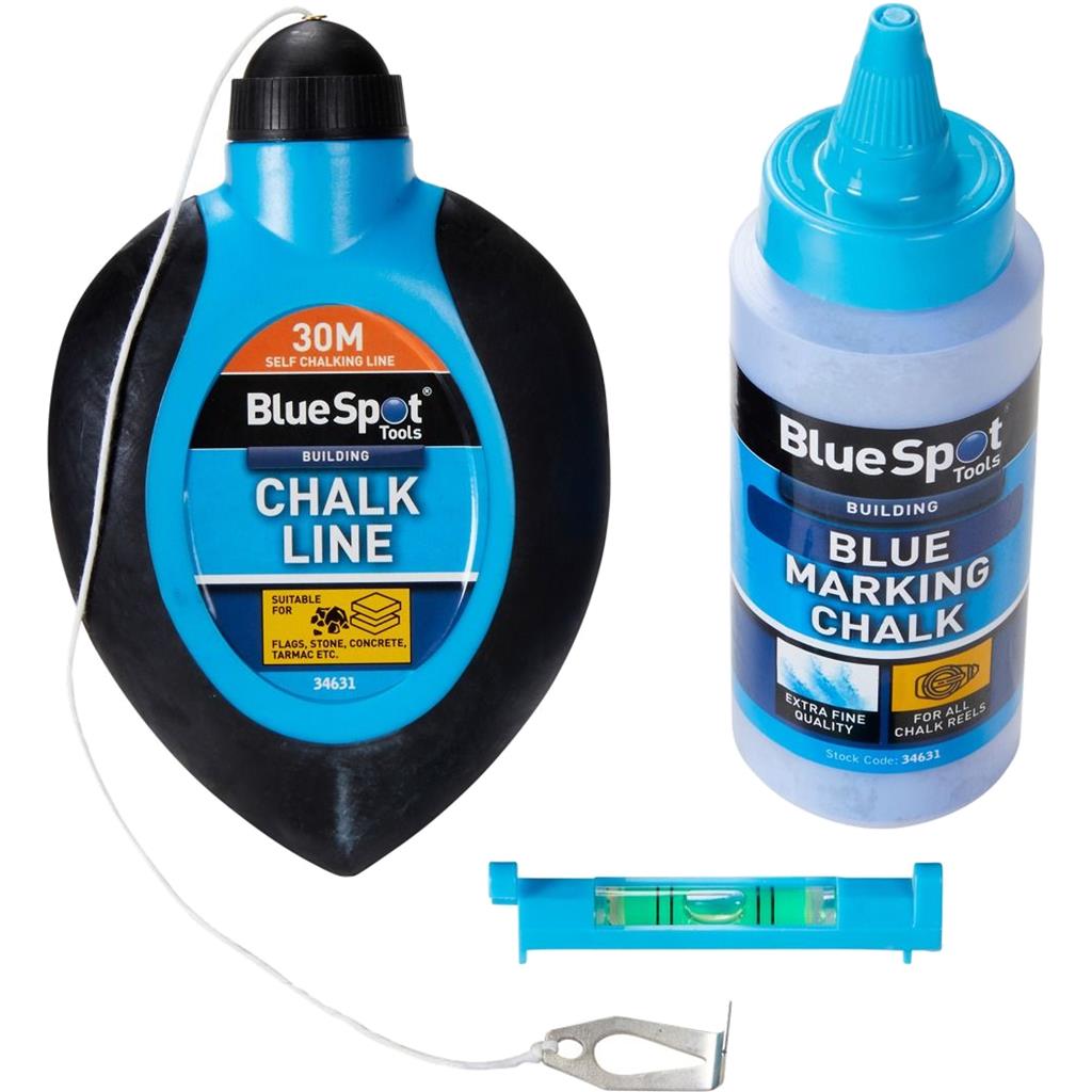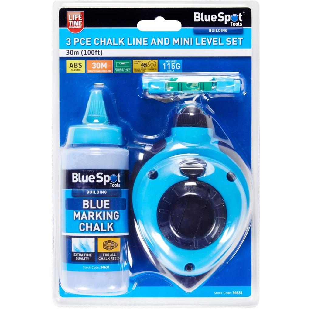 The Blue Spot Tools 30Mtr (100ft) 3Pce Chalk Line and Mini Level Set is manufactured from ABS Plastic for increased durability. The ideal quick and accurate way to mark the ground with straight lines prior to building work, comes complete with a durable plastic mini line level and 115G of chalk.