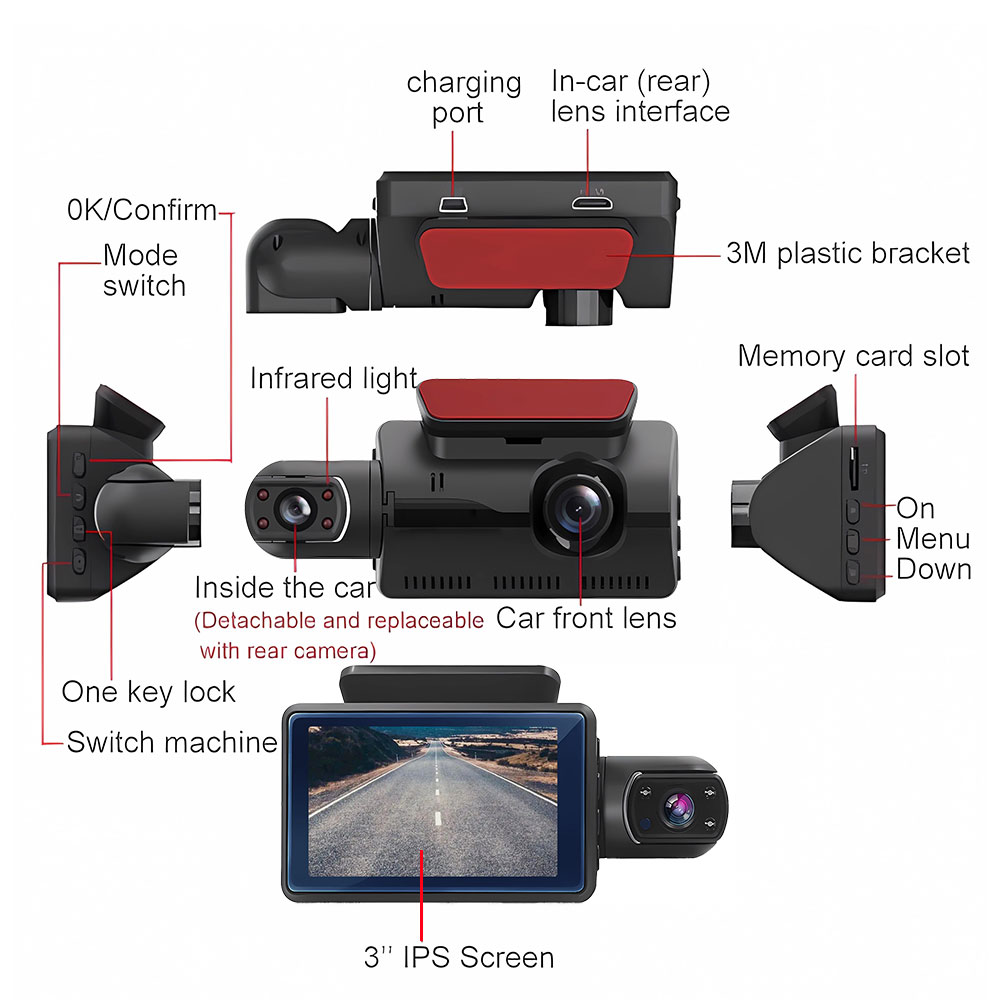 The dashcam can record high-definition video images and sounds of the whole process of car driving, and has night vision function. Objects in the dark can also be clearly displayed, and more details can be restored to fully protect driving safety.