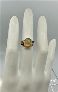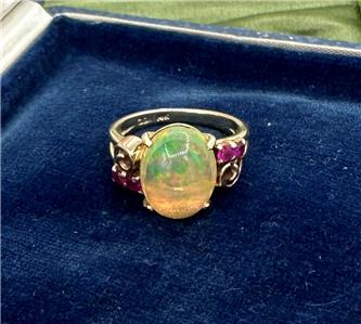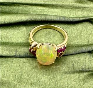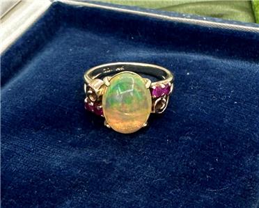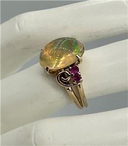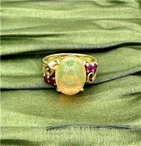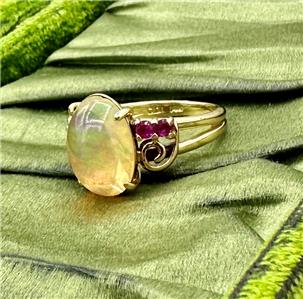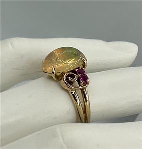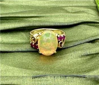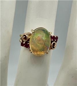 The ring is 14 Karat Gold. The sparkling oval Mexican Fire Opal is approximately 4 Carats and is one of the most gorgeous fire opals we have seen. The opal cabochon has magnificent radiant orange, yellow, red and green fire. The opal is 13mm by 10mm by 5mm. The opal is accented by four gorgeous round faceted Ruby gems in a wonderful Retro scroll motif design. This combination of the opal and ruby gems creates a dynamic, dramatic, stunning Retro jewel.