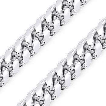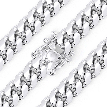 The featured Italian-made 12mm chain bracelet is made up of Miami Cuban curb links cast in .925 sterling silver. The bracelet is plated with rhodium then finished with a box-lock w/ pressure clasp for secure wear.