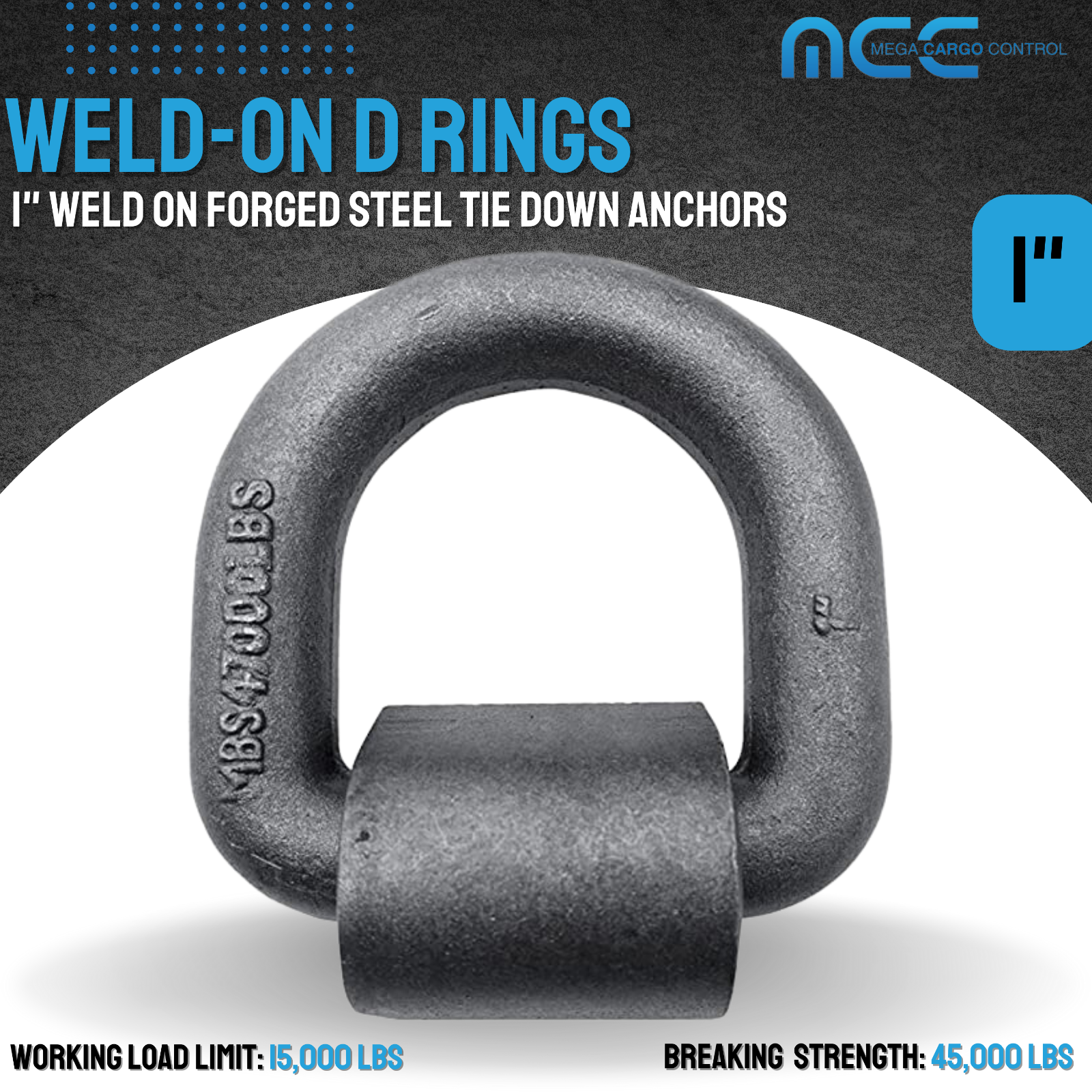 The Mega Cargo Control 1" in Diameter Weld-On Forged Steel D-Ring is a great tool to tie-down applications. - Made of solid steel, this forged black D ring has a working Load Limit: 15000 LBS and a Breaking Strength 45000 LBS.