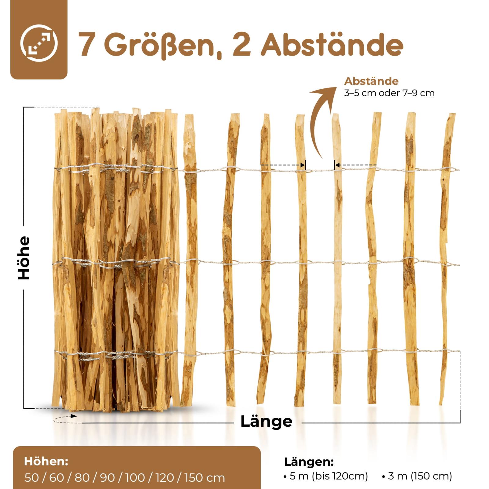 Zaunelemente in vielen Größen: Höhe: 50cm, 60cm, 80cm, 90cm, 100cm, 120cm, 150cm | Länge: 3m, 5m | Lattenabstand: 3-5cm, 7-9 cm