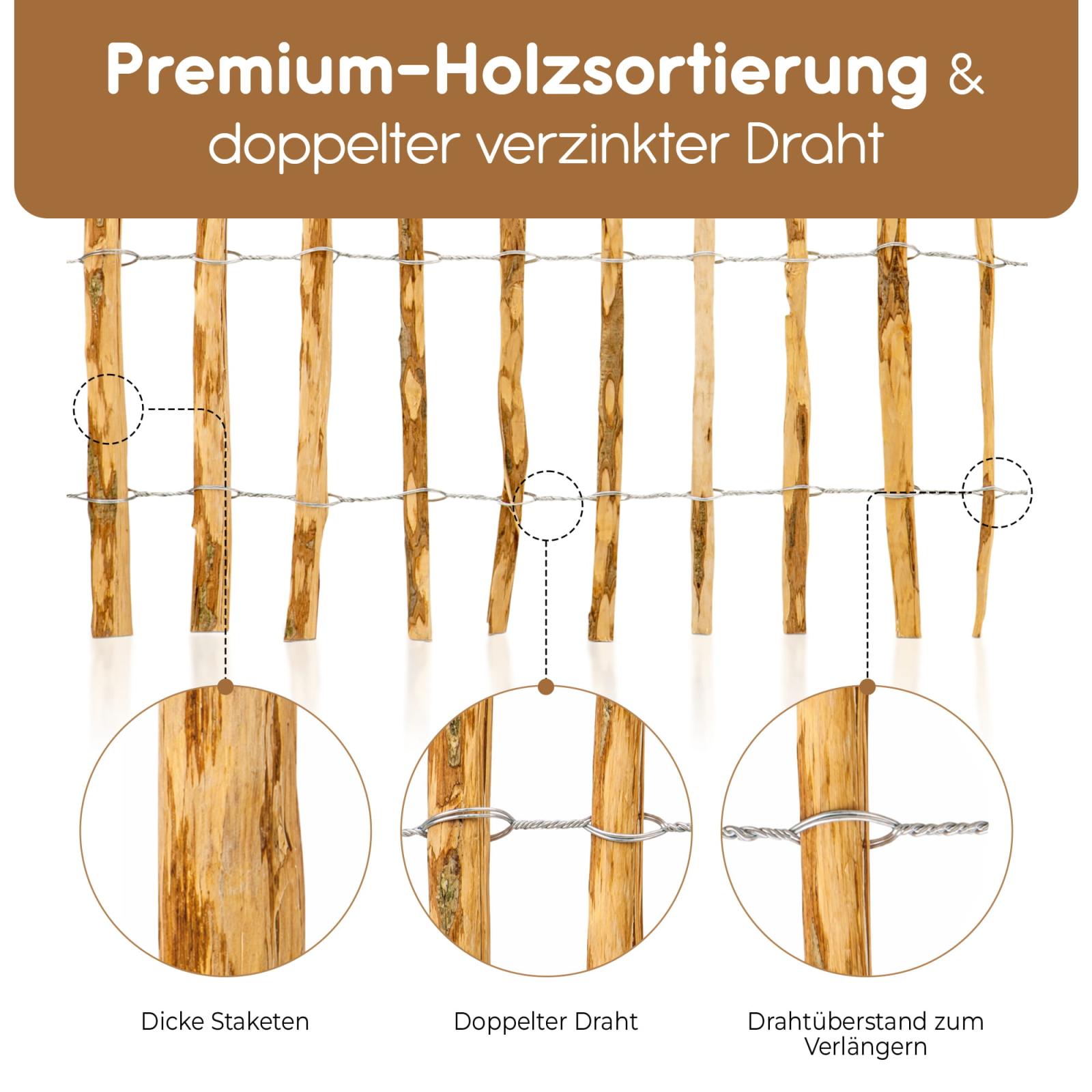 Unser naturbelassener Holzzaun hat eine doppelte Drahtumspannung mit verzinktem, widerstandsfähigem Metalldraht und lässt sich einfach aufrollen und mit Leichtigkeit anbringen.