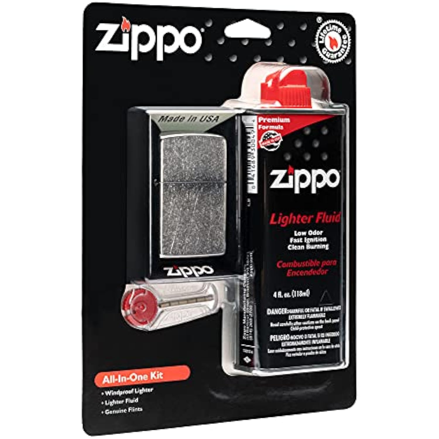 Product Description Zippo's All-in-one kit has all the essentials needed to operate your lighter. This kit includes a Zippo Street Chrome lighter, flint dispenser (6 flints), and a 4 ounce can of Zippo lighter fluid. The Street Chrome lighter is back by Zippo's famous lifetime guarantee. The flint dispenser will keep your lighter working at its top performance. The lighter fluid can be used to fill your windproof lighter or Zippo's refillable hand warmers. Comes packaged in a clam shell. Made in USA. -- The ever-satisfying, globally-recognized "Zippo click" is one of the more distinctive sounds you'll hear, and this classic lighter brings it to you in an elegant and refined matte chrome finish. The all-in-one kit also includes four ounces of lighter fluid and six replacement flints with an installation tool. Made in the USA, all Zippo lighters feature sturdy construction and a wind-proof flame. Zippo's Guarantee Any Zippo pocket lighter, when returned to the factory, will be put in first-class mechanical condition free of charge, regardless of age or condition.
