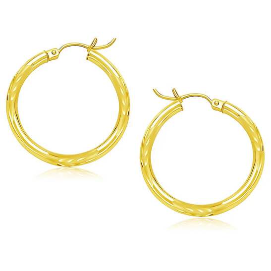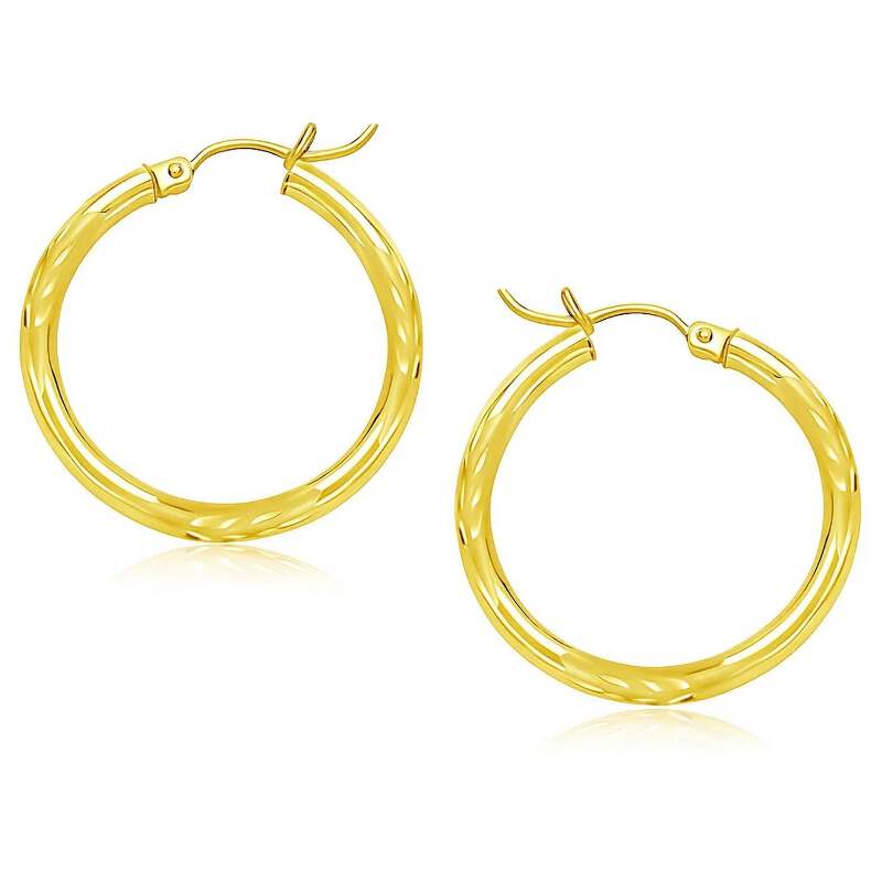 These timeless diamond cut hoop earrings are crafted in 14k yellow gold and measure 25 millimeters in diameter, featuring a snap lock backing.