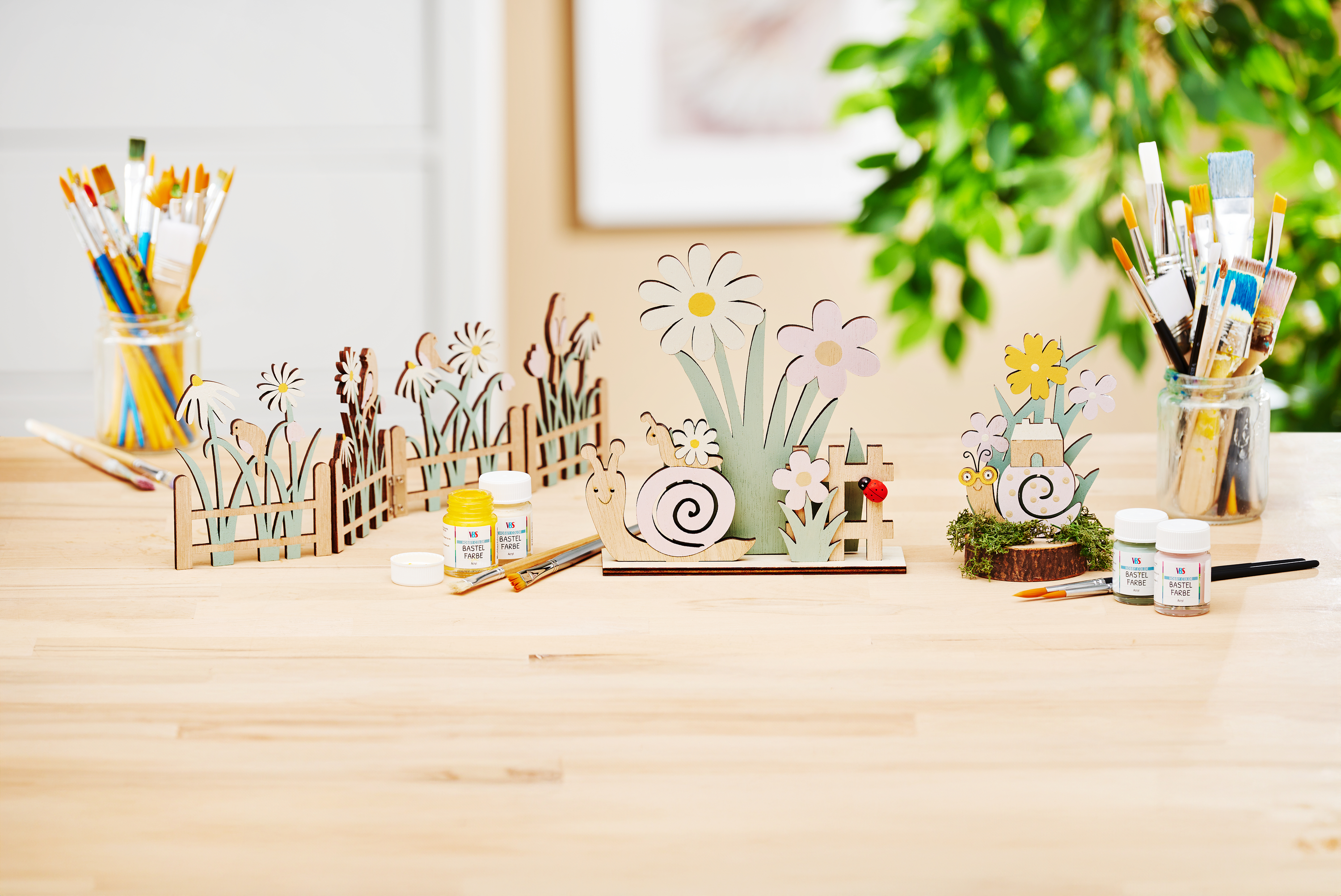Das Sortiment umfasst Bastelmaterialien, Werkzeuge, Handarbeitsartikel, Dekorations- und Einrichtungsaccessoires für die kreative Weiterverarbeitung.