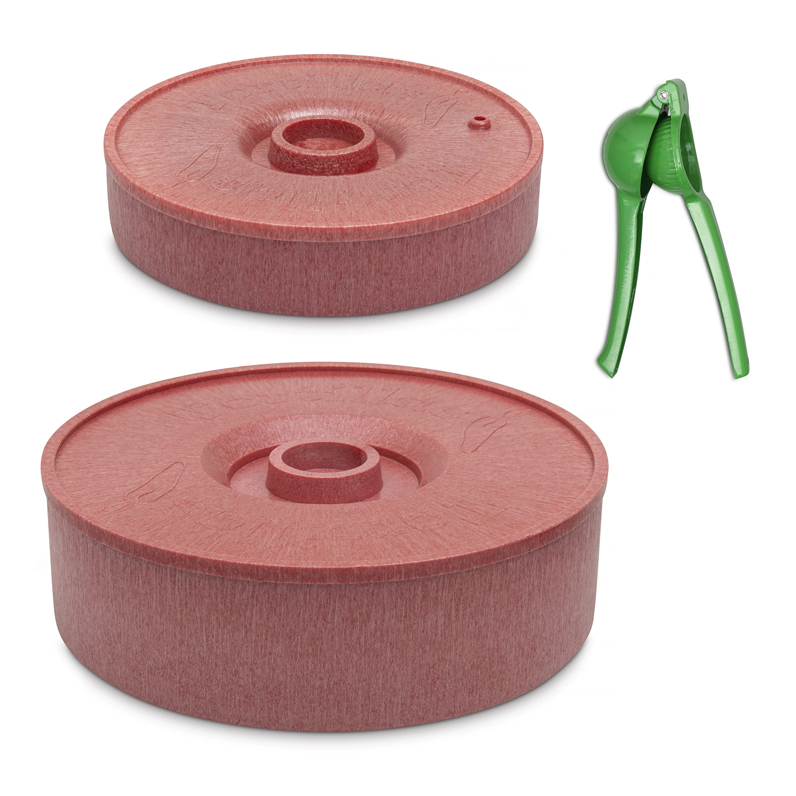 2 Pack of Red Tortilla Warmers complete with lime squeezerThe perfect addition to your Mexican Fiesta! Enjoy warm, soft and fresh tortillas throughout your meal with our 2 handy size Tortilla wrap Servers. The 8.7" medium size warmer can hold up to 16 regular 8 inch tortilla wraps, So you can enjoy perfect tortillas all evening! The smaller 7" warmer is ideal for your mini tortilla wraps, up to 7 inch wide, and holds up to 8 servings, super handy for serving party nibbles.Convenient Design and Lid The durable food grade reinforced thermal insulated plastic keeps your tortillas soft and warm for serving, and you can even use the containers to warm or reheat your food. Multi-use! The containers can also be used to store different kinds of food or items in the fridge or pantry! Suitable for Tortilla Wraps and More! Holds perfect pancakes, crepes, pita bread, biscuits, rice, potato mash and all sorts of nibbles and also non-perishable foods and even suitable for storing many household items Microwave and Dishwasher safe No mess-Hassle Free Meals! Just pop the tortillas in the container, with the lid loosely covered into the microwave for approximately 20-30 seconds or more depending on your settings to quickly warm them up. When you’re finished, both the container and lid can safely go into the dishwasher. Lime SqueezerAs a valuable extra, we have an amazing quality green coated metal full size lime squeezer; making your Mexican dinner even more delicious! What's ?1 x 8.7" diameter red tortilla Warmer 1 x 6.9” diameter red tortilla warmer 1 x green coated metal lime squeezer