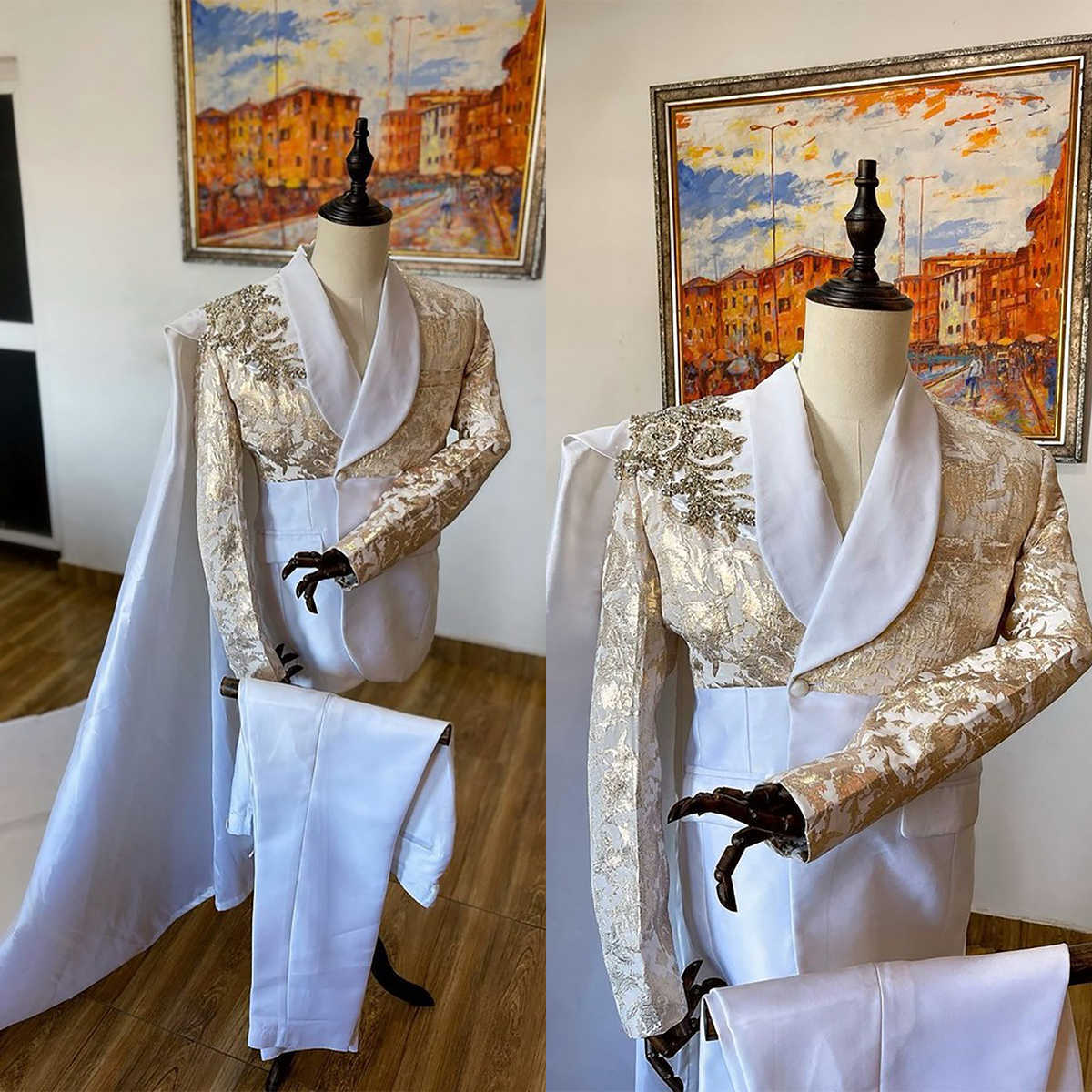 Fashion New Jacquard Suits 3 Pieces with Long Cape Wear for Red Banquets Wedding
