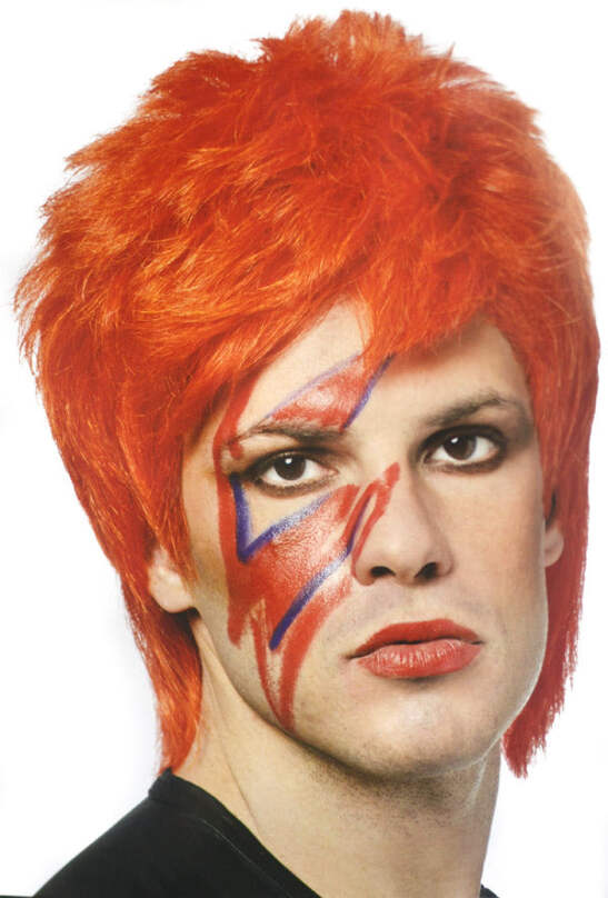 A short, spiky bright neon orange wig. The back hangs down to just about the nape of the neck. Package includes wig only. For best results, use with a wig cap to hold in your own hair.