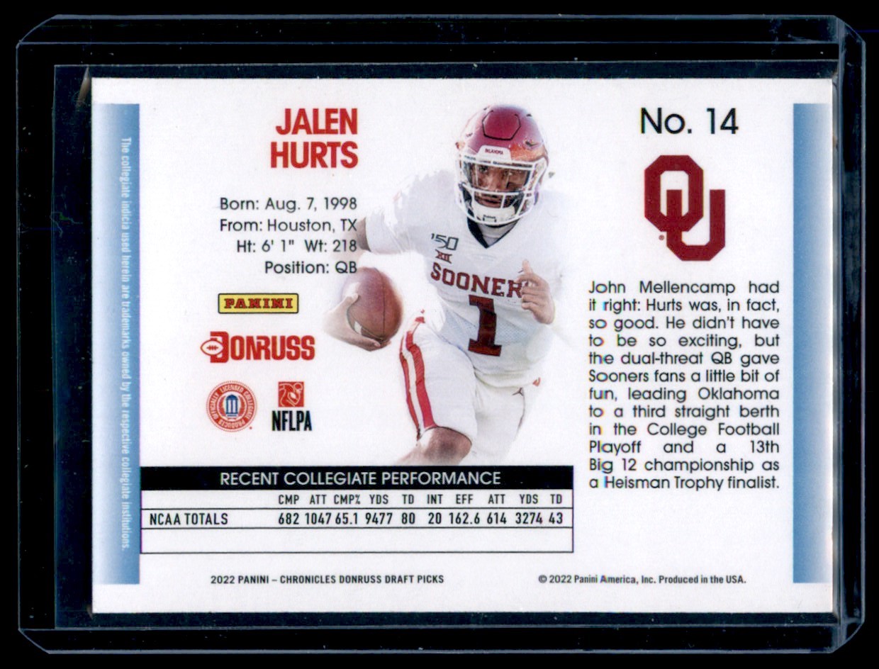 | 2022 Chronicles Donruss Draft Picks Jalen Hurts Rookie Philadelphia Eagles #14 |