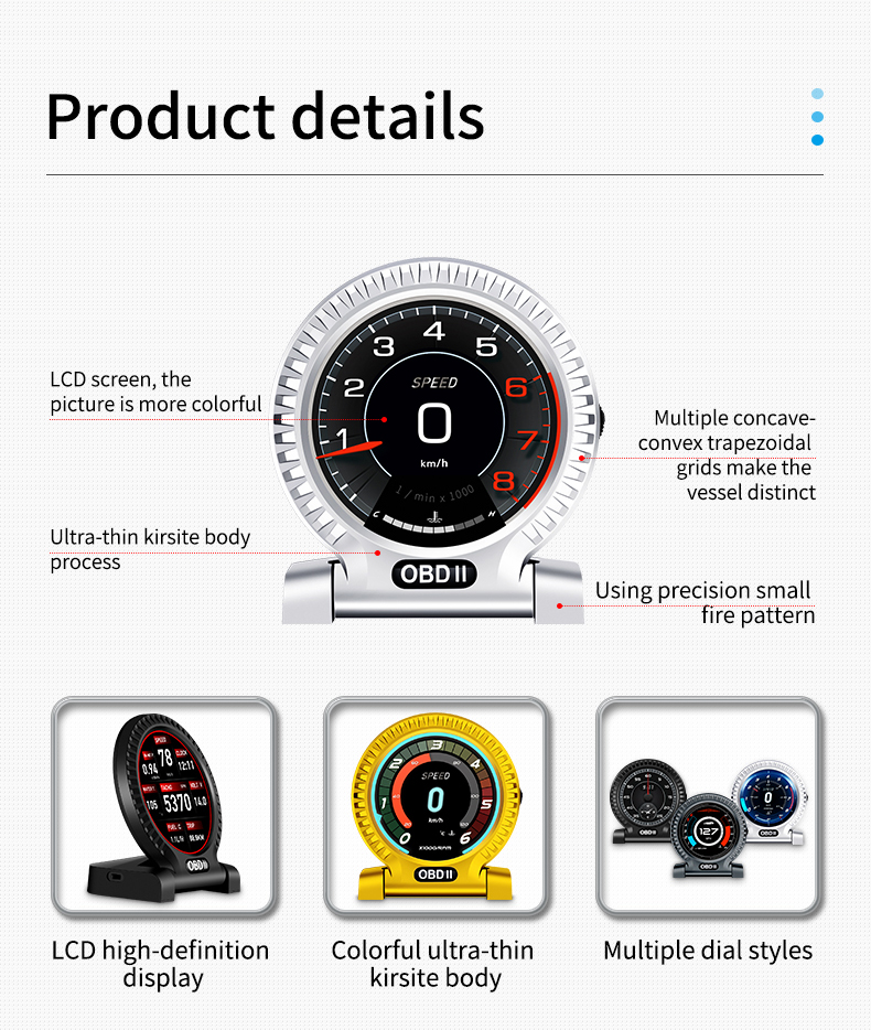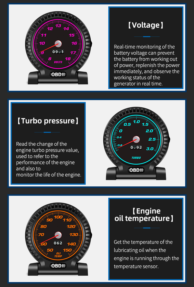 The OBD universal driving computer is equipped with a very powerful fault detection device. The system clearly displays the fault information in the form of text, and has the function of eliminating the fault. It has an accelerated competition mode display, a brake performance test display, and a readout of the entire vehicle. Data flow information display, and other functions in one.