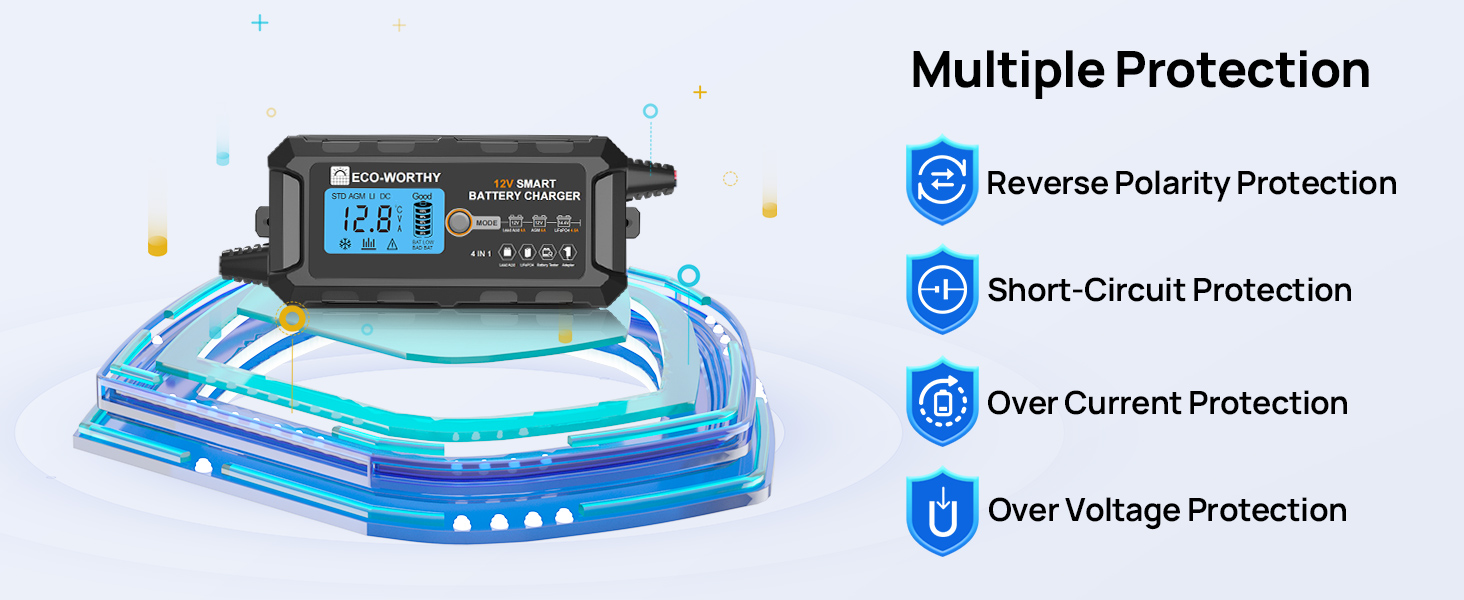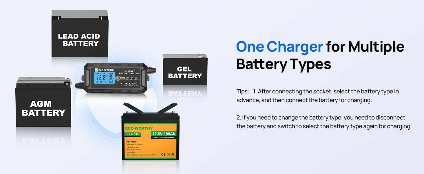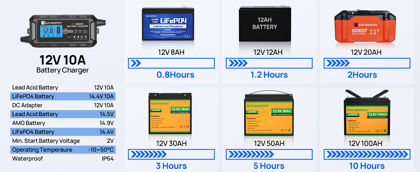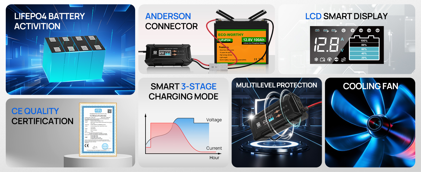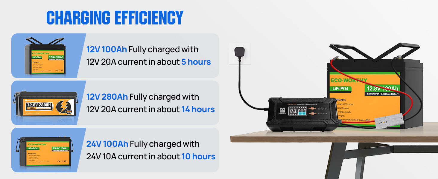 The ECO-WORTHY 5A/10A/20A 12V Li-Ion Battery Charger quickly charges Li-Ion batteries of varying amp hours. After PCM activation and soft start, the charger will supply a constant high capacity current to the battery, quickly charging the battery up to 80% SOC, with the 20A size switching between 12V/24V voltage for intelligent fast charging.