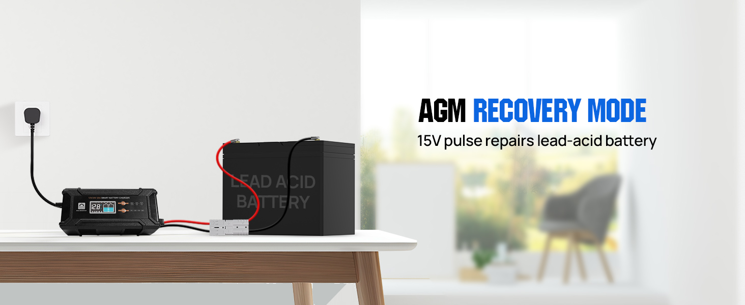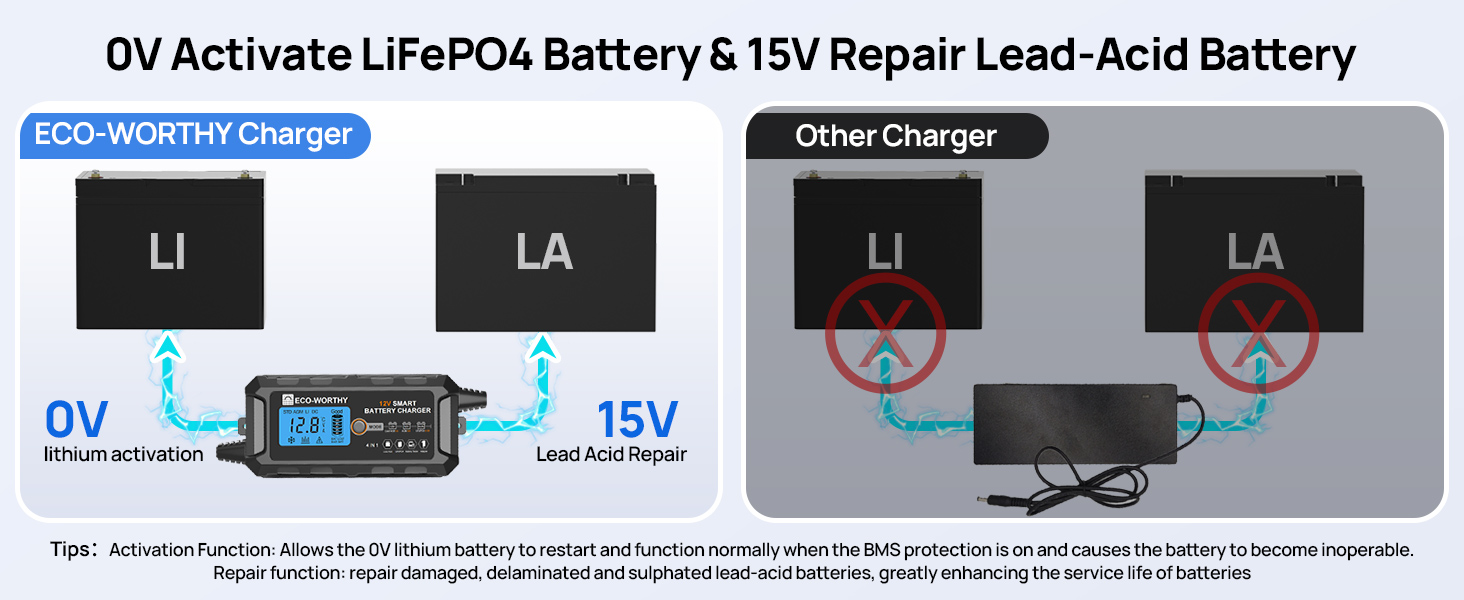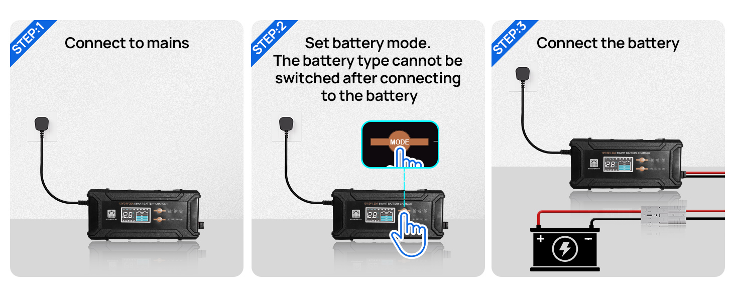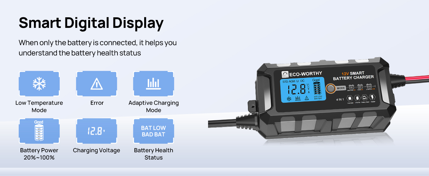 The ECO-WORTHY 5A/10A lithium battery charger has LCD smart display.Hold the MODE button for 3~5S, the charger will be in DC adapter mode, supplying 120W output(12Vdc&5A/10A) with LCD showing DC.