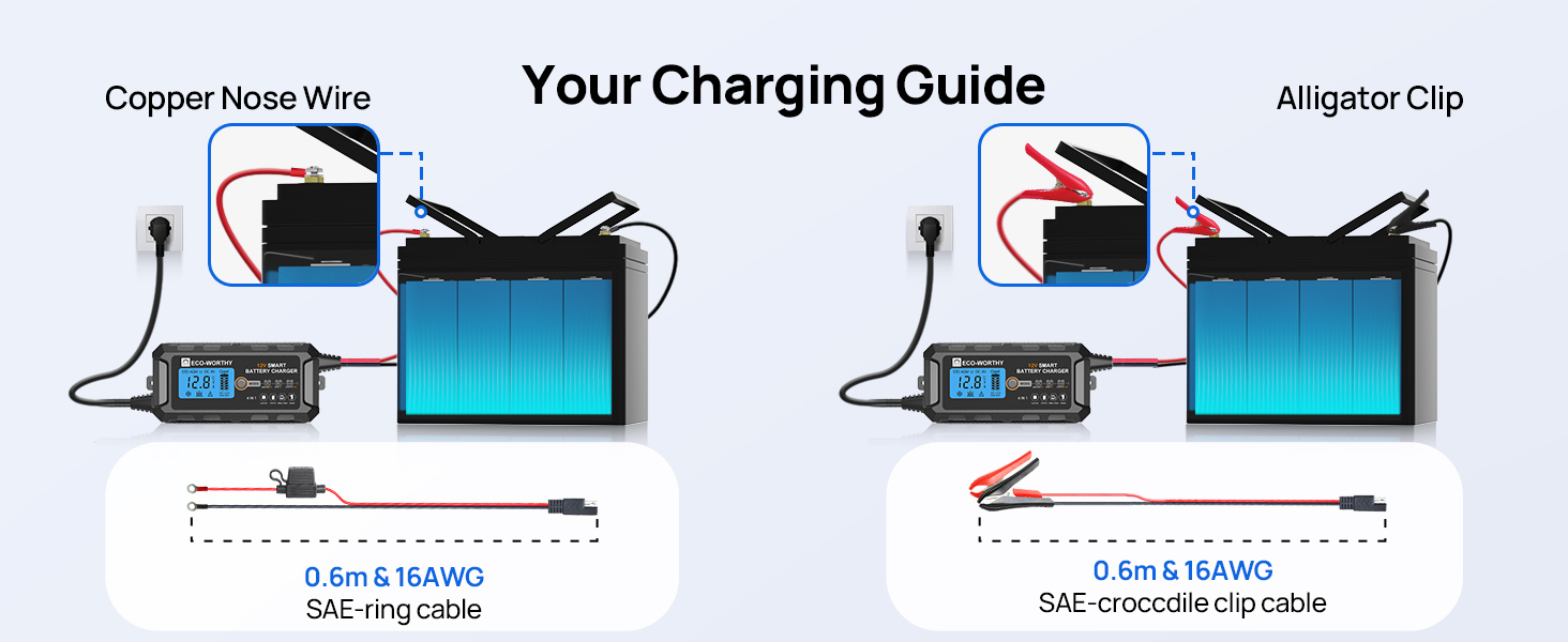 Use the included battery clip and O-ring terminal cable with 10A fuse to easily connect to the vehicle battery. The SAE connector is plug and play.