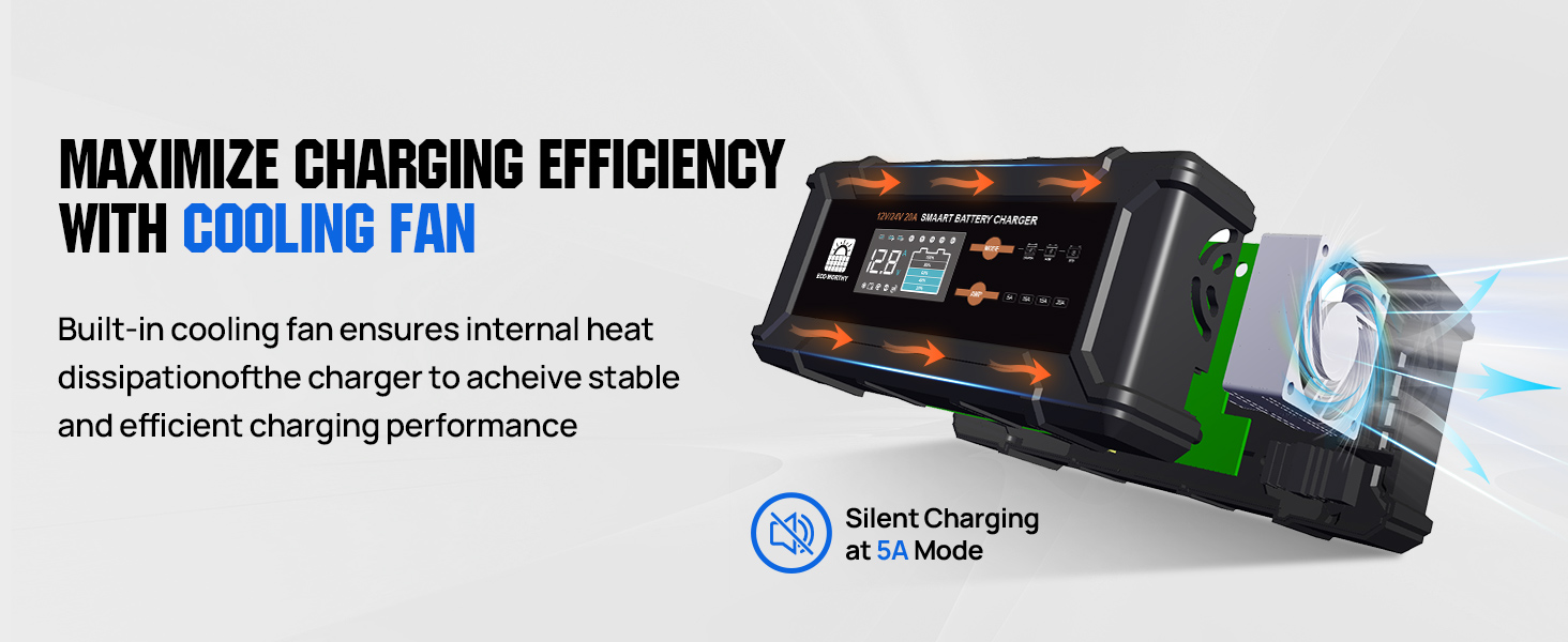 The ECO-WORTHY 20A lithium battery charger’s normal operating temperature is -5℃~40℃. When the temperature reaches 80°C, it will automatically cut off the charging. Meanwhile, the battery charger comes with a cooling fan, which will dissipate the heat when working.
