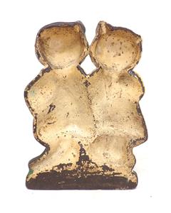 A vintage cast iron doorstop, manufactured by Hubley, inventory number 73, depicting a pair of kittens wearing adolescent's clothing. It weighs 5 pounds 3 ounces, and measures 7 1/2" tall by 5 1/4" wide by 1 13/16" deep. The item is in original paint, with minor paint touch-up, some chipping and other signs of age and use, making for a very attractive presence, showing its age appealingly. The item is listed in the Smith Doorstop book as from $450.00 to $550.00.