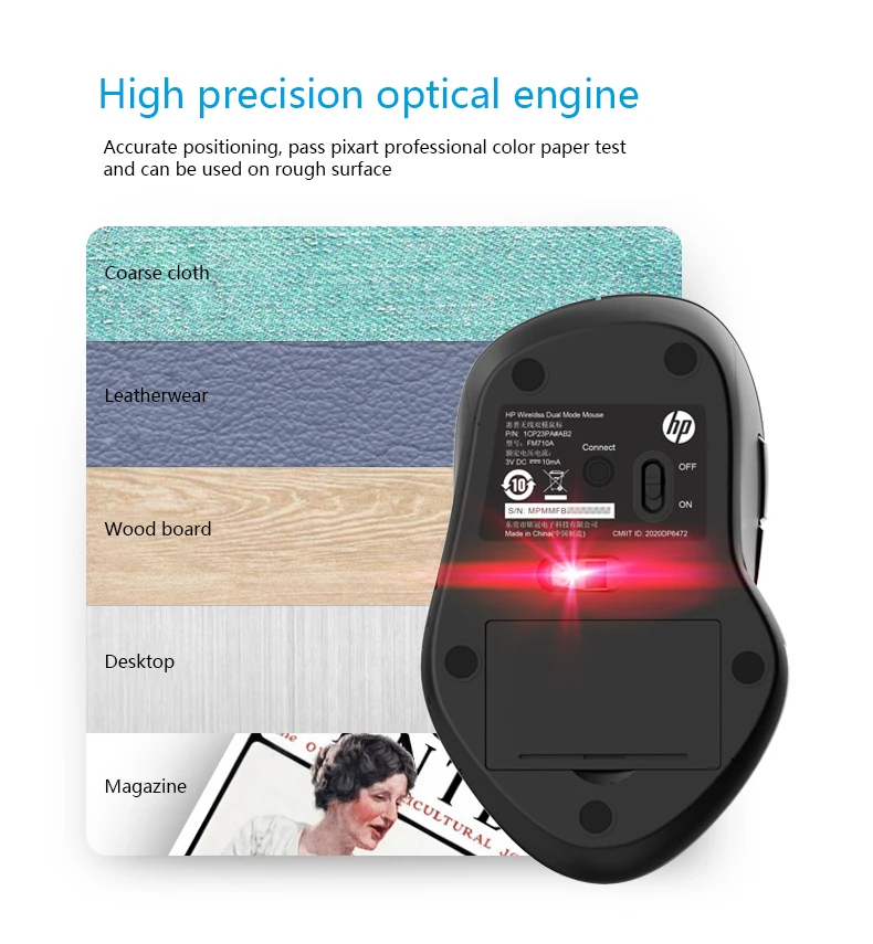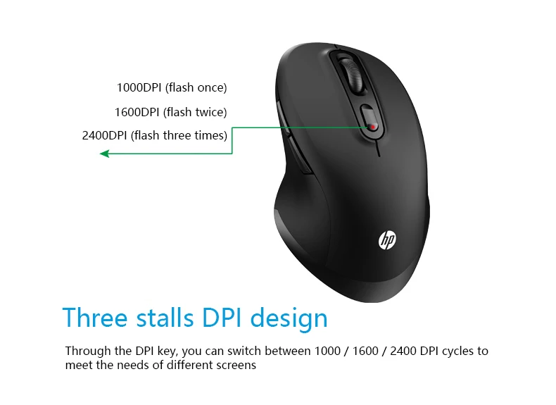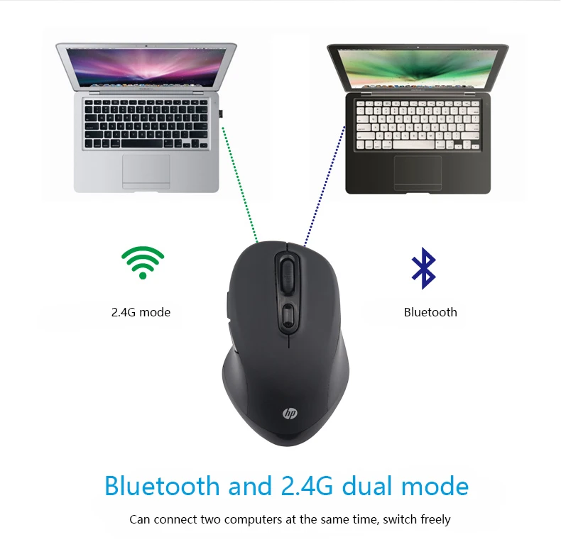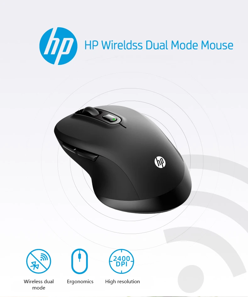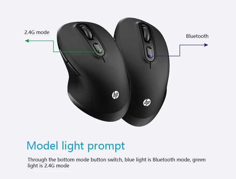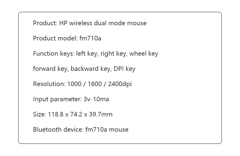 HP FM710A Wireless Bluetooth Mouse Wireless Bluetooth Dual Mode Free Switch Mice Number of keys: 6 Colour: Black Connection mode: multi-mode Product type: portable mouse Working method: photoelectric Resolution: 1000/1600/2400DPI Input parameters: 3V-10mA Product net weight (g): about 250 Resolution: 2400 Product size (mm): 118.8*74.2*39.7 Bluetooth device name: FM710A Mouse