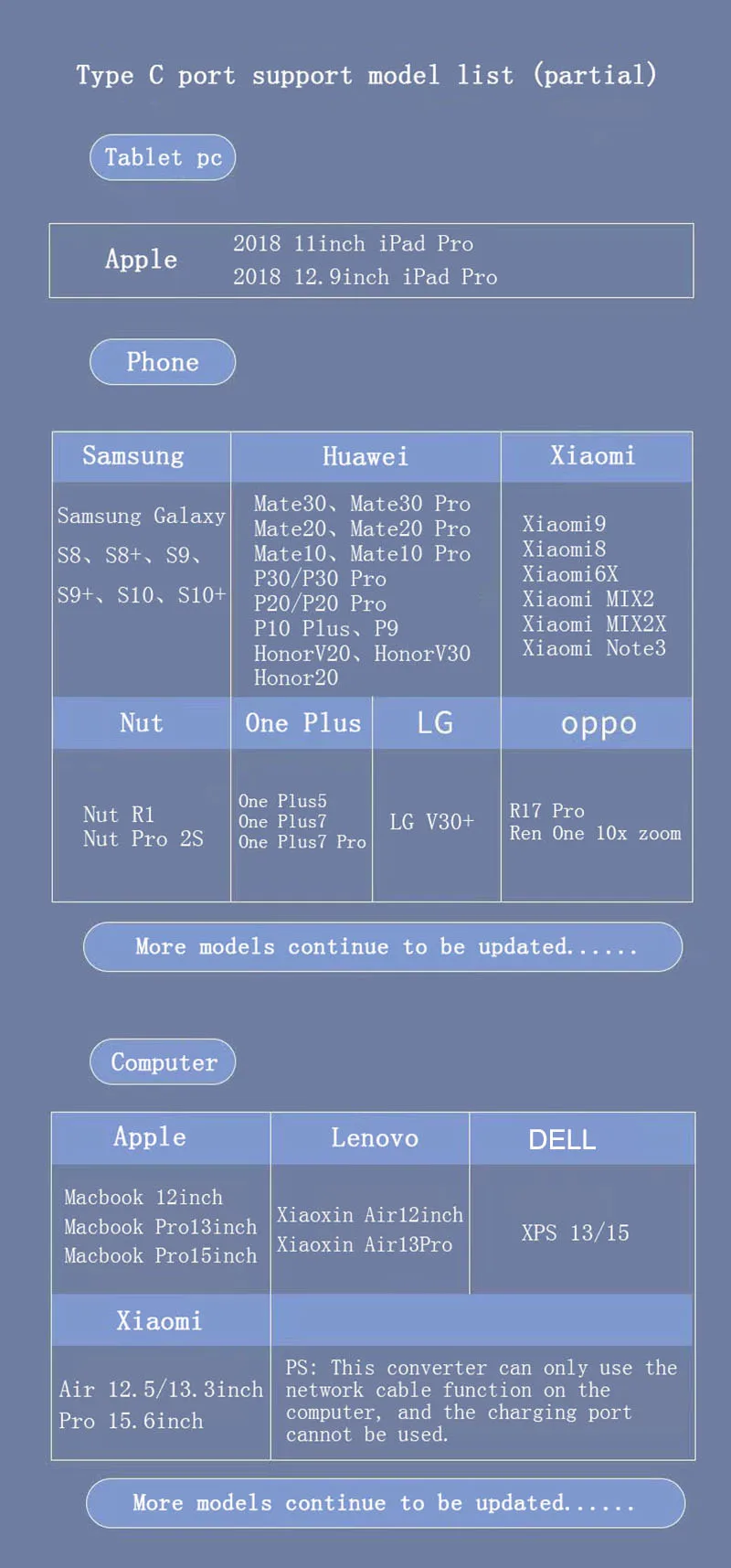 TYPE-C to Ethernet adapter is specially developed to solve the wireless network interface of TYPE-C equipment, WiFi and data traffic are unstable, and can not use TYPE-C equipment such as campus network. The serial port can be connected to the TYPE-C device, so as to achieve continuous and fast Internet access, and use the TYPE-C female seat to charge the device at the same time.
