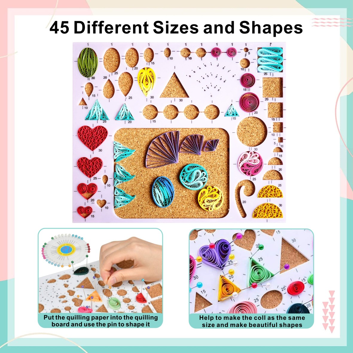 - Quilling template shapes are made of plastic and cork, each mold has scale that helps to make consistent quilling patterns