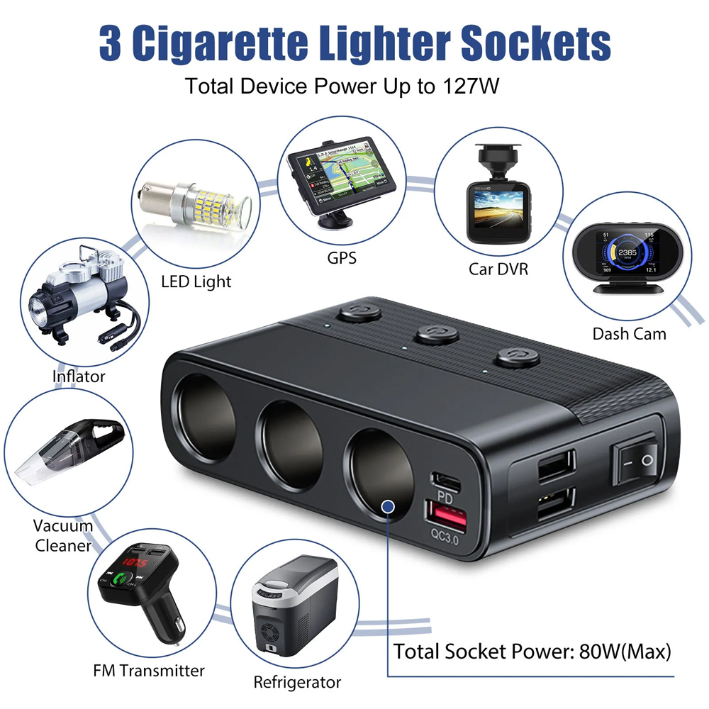 Expandable Connectivity: Expand your car's 12V/24V cigarette lighter from 1 to 3 outlets, allowing you to connect multiple devices simultaneously, such as dash cams, GPS, car humidifiers, and more.