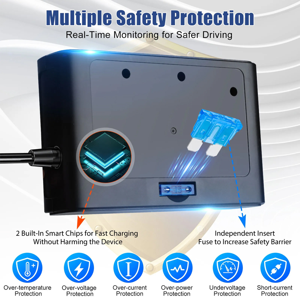 Convenient and Safe Design: Each lighter socket has an independent On/Off switch, preventing the need for repeated plugging and unplugging. LED voltmeter display allows real-time monitoring of car battery voltage. Safety features include protection against over-voltage, over-loading, over-heating, short-circuiting, over-current, and over-charging.