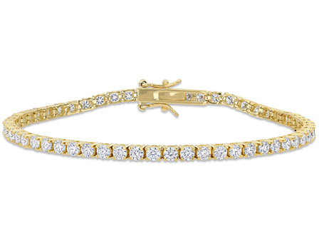 Look extraordinary when you wear this Moissanite Tennis Bracelet. Crafted in lustrous yellow rhodium plated sterling silver, this bracelet features 56 round cut, prong set created white moissanite gemstones (3 x 3mm) placed in a line. Enhanced with a high polish finish, this alluring tennis bracelet makes a valuable addition to any jewelry collection. This dazzling gemstone bracelet measures 7-inches in length and secures with a pressure tongue clasp.