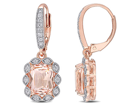 Express your love with these enchanting Tangelo Simulated Morganite and Cubic Zirconia Drop Earrings. Crafted in flickering rose rhodium plated sterling silver, they are enhanced with a high polish finish. These earrings feature simulated morganite gemstones at the center surrounded by cubic zirconia gemstones forming halos. These gemstone drop earrings secure with leverback closures. Coordinate these gemstone earrings with any ensemble for a fashionable look.