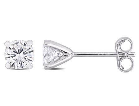 Beautiful and timeless, these Moissanite Solitaire Stud Earrings make the perfect addition to any jewelry collection. Crafted in lustrous sterling silver, they feature two round cut, prong set, flickering created white moissanite gemstones (5 x 5mm). Enhanced with a high polish finish, these alluring stud earrings secure with butterfly closures. These stylish moissanite stud earrings give a look of lavish style ideally suited for any event.