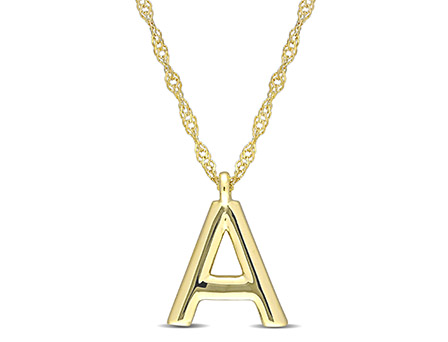 Make a personal statement of style with this charming Initial Pendant. Crafted in precious yellow gold, this pendant features a block font letter A. Enhanced with a high polish finish, this lovely gold letter suspends freely along a 17-inch light weight Singapore chain that secures with a spring ring clasp. A little funky, a little fun, this gold initial pendant is all about style.