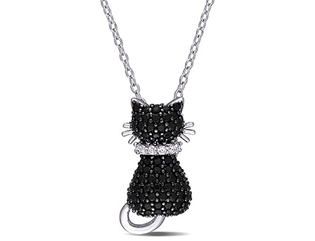 Delight the kitten lover on your gift list by presenting her with this Black Spinel and Created White Sapphire Cat Pendant. Crafted in lustrous sterling silver with black rhodium plating, it features 90 round cut, pave set black spinel gemstones (1.5 x 1.5mm) with six round cut, prong set created white sapphire gemstones (1.25 x 1.25mm) to form the shape of a cat. Suspended on an 18-inch round cable chain, this necklace secures with a spring ring clasp. Polished to a brilliant shine, this gemstone pendant is the perfect addition to any animal lover's jewelry collection.