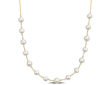 Be the queen of elegance with this classy By the Yard Necklace. Mounted in lustrous yellow gold plated sterling silver, this enchanting necklace features five 8-8. 5mm and 10 6. 5-7mm cultured freshwater pearls placed at regular intervals. This 18-inch necklace is secured with spring ring clasp. Enhanced with a high polished finish, this versatile necklace is perfect for an important meeting or a date night.