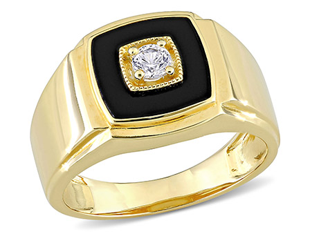 Look extraordinary in this Black Onyx and Created White Sapphire Men's Square Band. Crafted in lustrous yellow rhodium plated sterling silver, it features a round cut, prong set created white sapphire gemstone (3.5 x 3.5mm) at the center with a halo of a fancy shape, prong set black onyx gemstone (10 x 10mm). Enhanced with a high polish finish, this gemstone men's band makes a fashionable addition to any jewelry collection and an ideal wedding band.