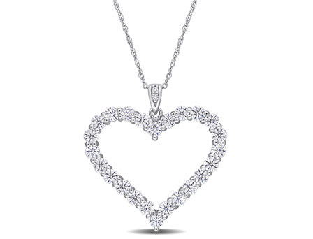 This lovely open heart necklace is crafted in sterling silver and features 26 round cut, prong set created white moissanite gemstones in a heart motif. Enhanced with a high polish finish, this pendant is hung on an 18-inch cable chain and is secured with a spring ring clasp. Enhance your favorite outfits with this enchanting ornament, which is both long lasting and versatile. This pretty necklace will bring fashion forward detailing to any look. A perfect addition to any jewelry collection. Style: Pendant Gemstone colors: White Gemstone shapes: Round 24 prong set round cut created white moissanite gemstones each measure 3 mm Gemstone weight: 2 2/5 carats Two pave set round cut created white moissanite gemstones each measure 1. 3 mm Gemstone weight: 0. 02 carat Total gemstone weight: 2 2/5 carats Metal: Sterling silver Finish: High polish Chain: Cable Chain length: 18 inches Clasp: Spring ring Metal weight: 2. 1 grams Pendant dimensions: 27. 9 mm wide x 27. 4 mm long Necklace dimensions: 1 mm wide x 18 inches long All carat weights and measurements are approximate and may vary slightly from the listed dimensions. Treatment code CR (created white moissanite). See Treatment Guide for further information.