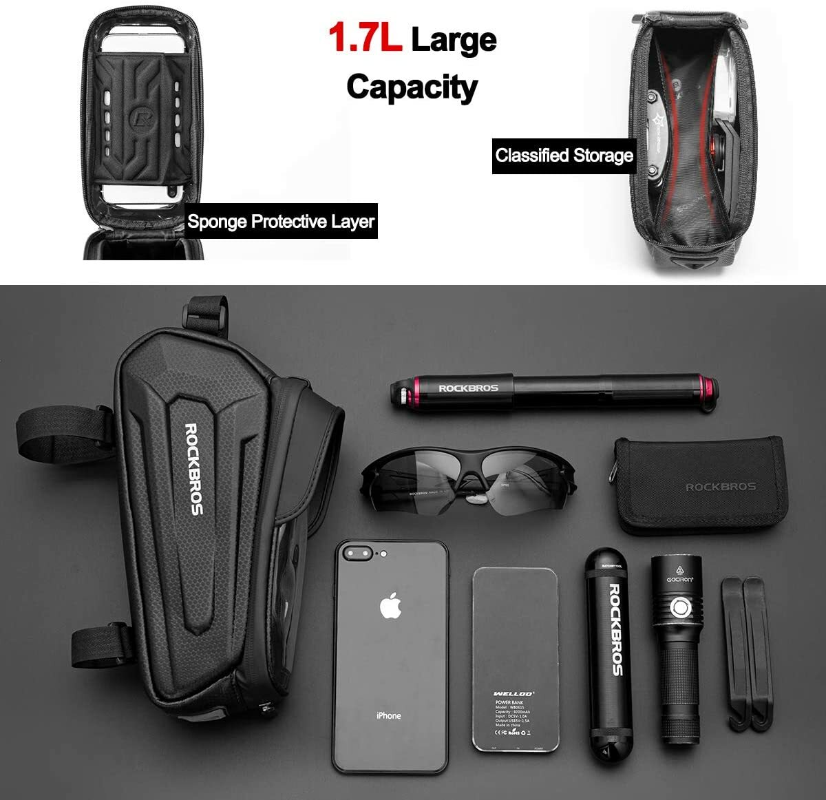 24*10*8.2CM. Capacité d'environ 1,7 L. Ce sac pour tube supérieur est déjà assez grand pour le cyclisme quotidien. Vous pouvez y mettre vos affaires comme une mini pompe, un smartphone, un portefeuille, des clés, etc.