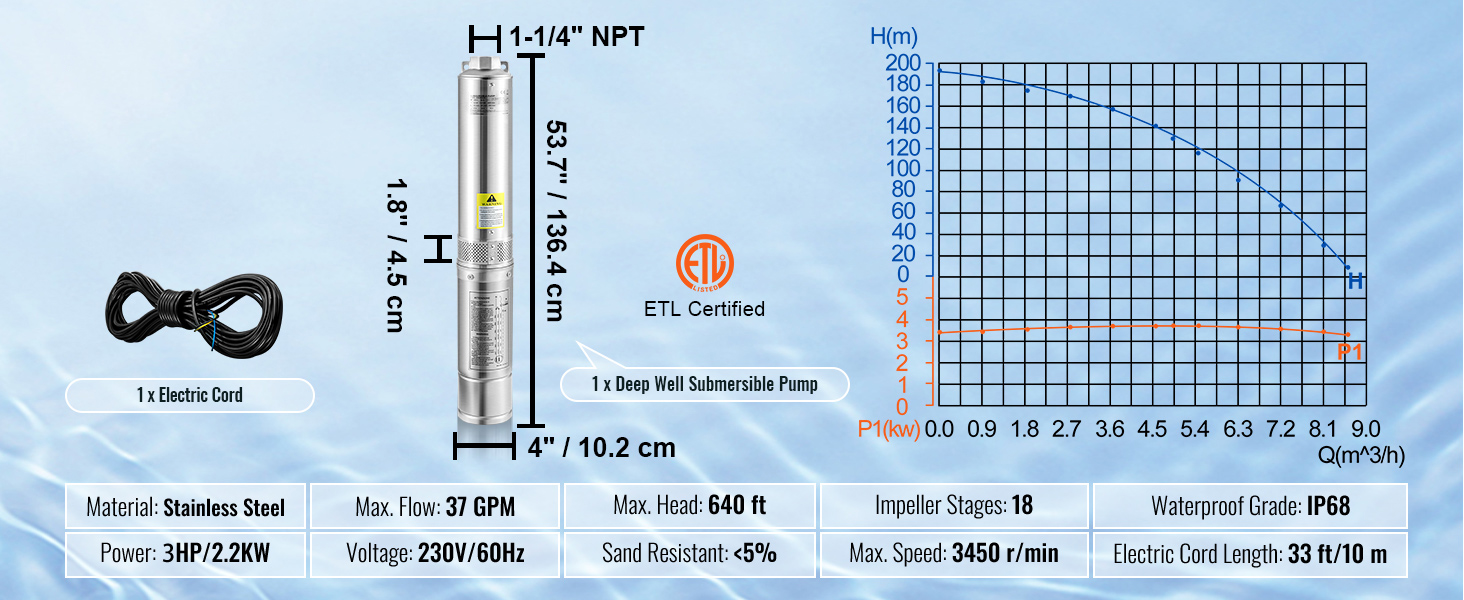 - Enhanced Pump Flow & Head: Power: 3HP, 230V; Diameter: 4" (for 4" or bigger well casing); Discharge: 1-1/4" NPT. This deep well submersible pump is designed with 18-stage thermoplastic impellers, providing 37GPM max flow and 640 ft max head. It comes with a 33 ft electric cord, making life without modern plumbing a lot easier. Pump out your worries with ease and relax. No challenge is too big for you.