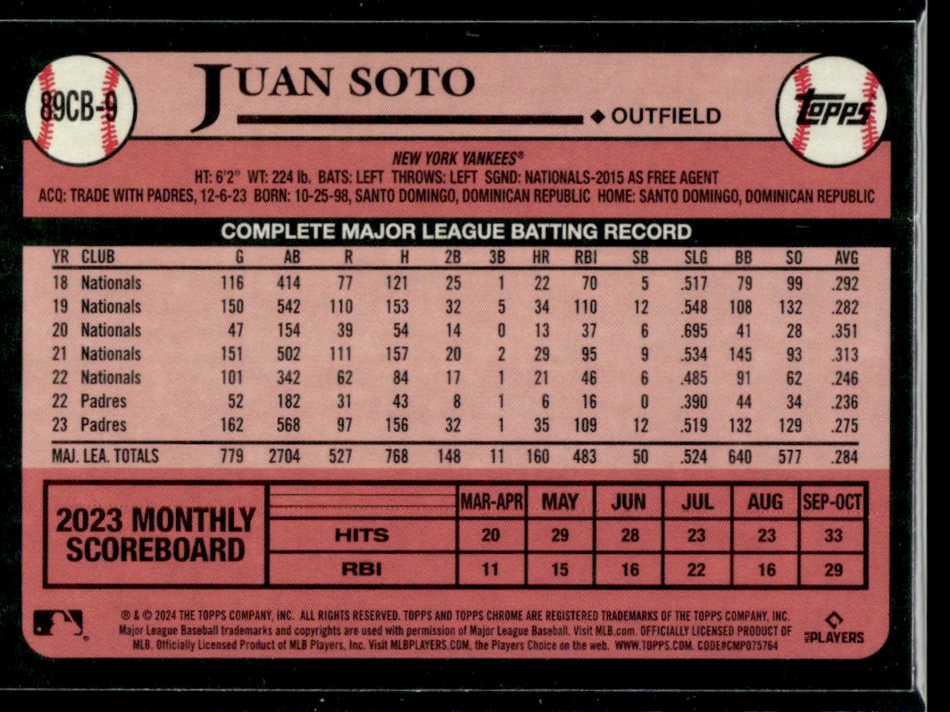 | 2024 Topps Chrome 1989 Topps Juan Soto New York Yankees #89CB-9 |