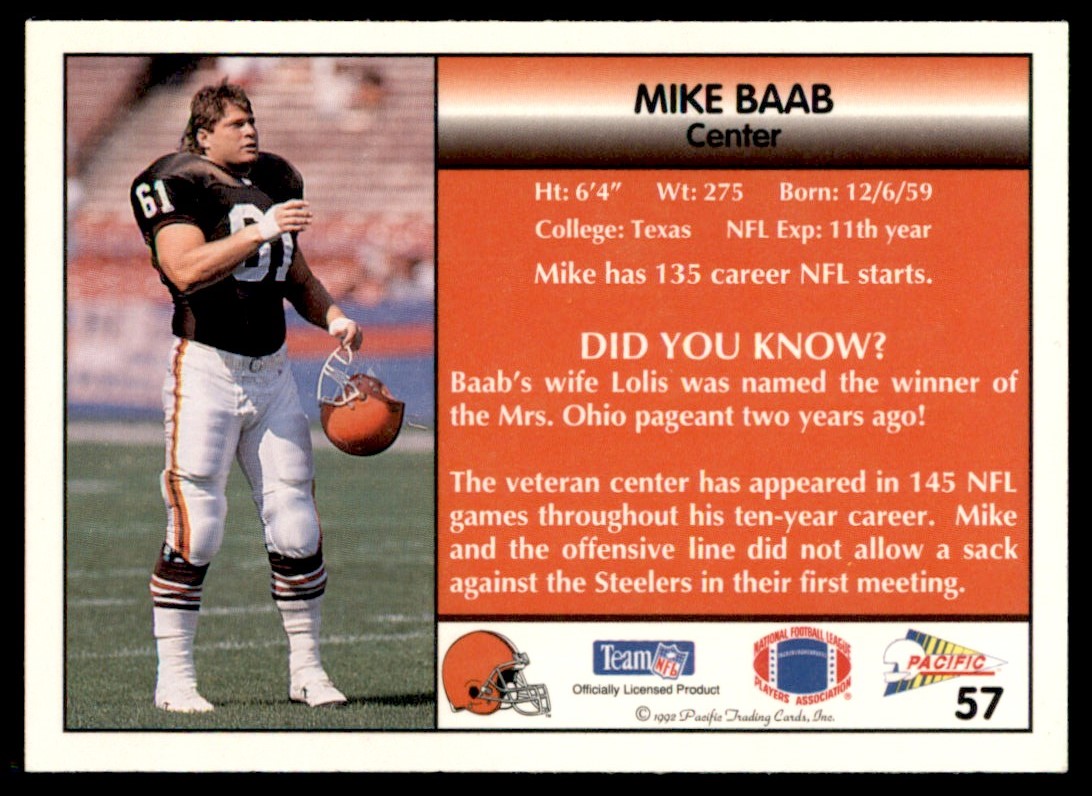 | 1992 Pacific Mike Baab Cleveland Browns #57 0964 |