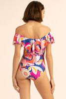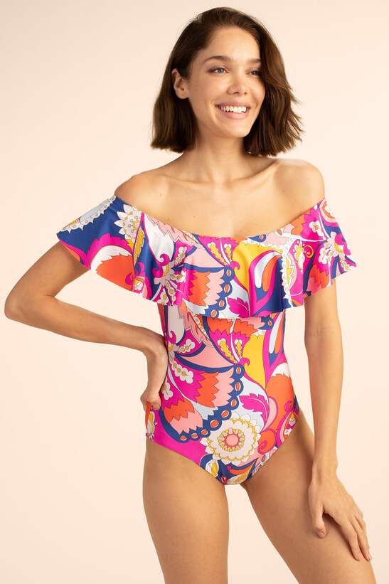 One of our most popular swim silhouettes, this off-the-shoulder ruffle one-piece swimsuit is chic, feminine, and just what you need in your summer swim wardrobe. Plus, you can wear it as a bodysuit for beach-to-bar versatility. Off the shoulder; Front ruffle; One-piece; Cheeky coverage; Runs true to size; see SIZE CHART; Model is 510, wearing size 4; Sevilla Print Swim Knit 80% Nylon, 20% Elastane; Hand wash; Imported;.