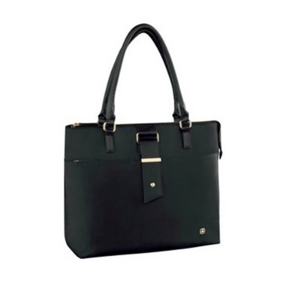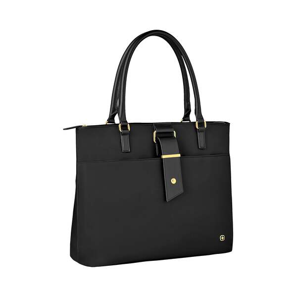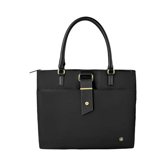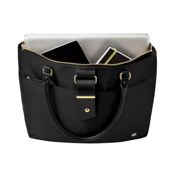 Wenger Ana Laptop Tote, Black Nylon (600772). Dimensions: 13. 8H x 16. 5W x 7. 5D. Rear pocket unzips to become a Pass-Thru trolley sleeve to slide over the handle of wheeled luggage for easy travel. Padded laptop pocket fits up to 15. 6 laptop for additional safety. ⚠ WARNING: This product can expose you to chemicals including lead and phthalates, which are known to the State of California to cause cancer and birth defects or other reproductive harm. For more information go to www. P65Warnings. ca. gov. This womens laptop tote keeps your notebook, tablet, and other work essentials neatly packed. Two big carry handles and removable shoulder strap make it easy to grab the tote and go. Comes in black and is made of nylon. Take your work with you by using this Wenger Ana womens black laptop tote.