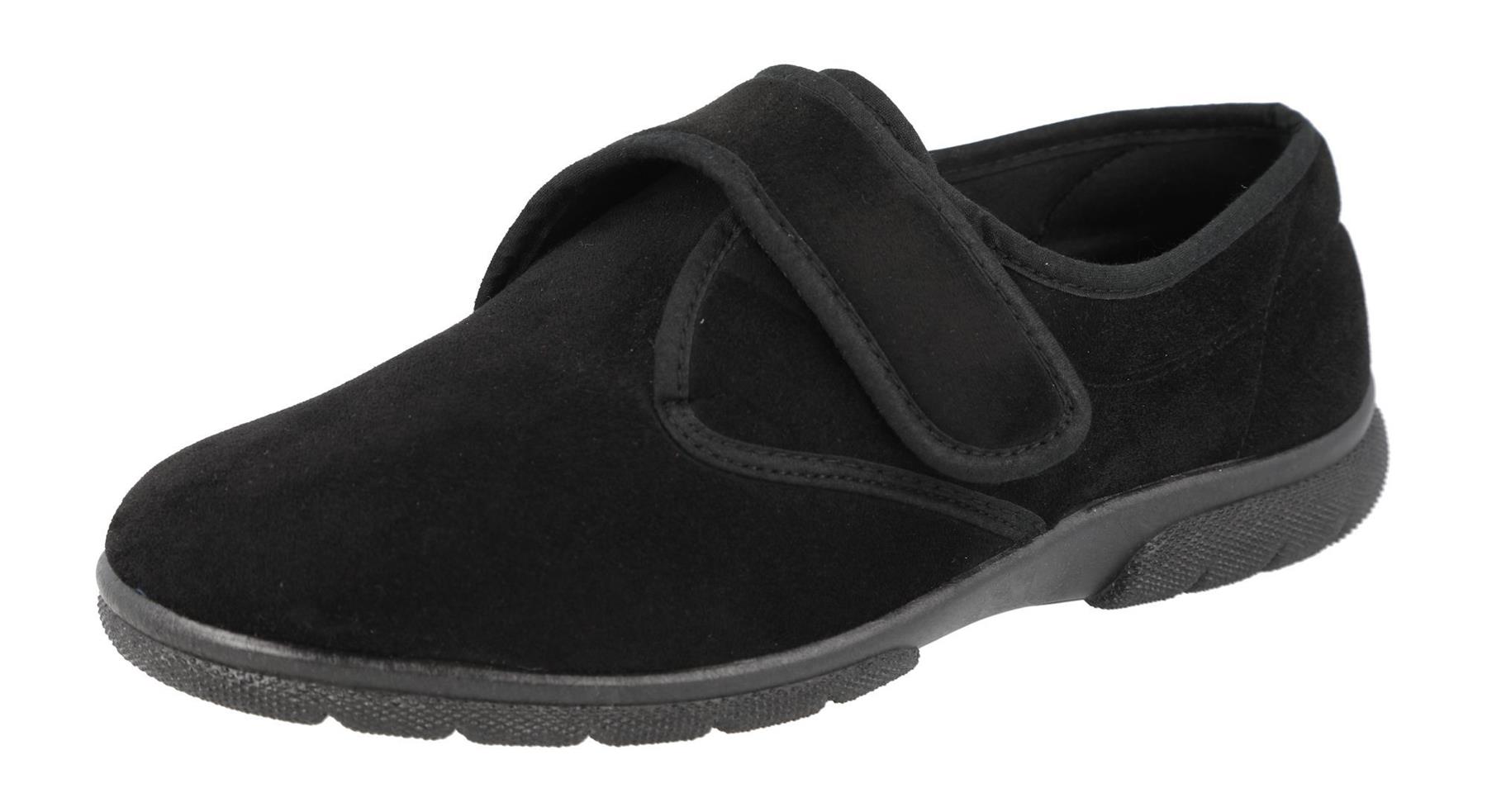Traditional style house shoe designed to be easy to slip on and off in a stylish suedette stretch, with adjustable touch straps to give an extra-supportive fit.