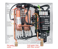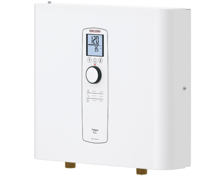 Powerful output, compact design, remarkable energy-saving features. Our whole house electric tankless water heaters perform with the highest standards for comfort and reliability. Tempera Plus models feature Advanced Flow Control, patented in Germany and exclusive to Steel Elton tankless heaters. If hot water demand exceeds working capacity, Advanced Flow Control automatically maintains consistent temperatures by slightly reducing flow. Intelligent self-modulating technology continually ensures the least amount of energy is uséd to heat the water. A Tempera 20 Plus provides hot water at a consistent temperature for 1-2 bathrooms in warm climates, or 1 bathroom in cool climates. See sizing to determine which model is best for you. Steel Elton invented tankless electric water heating technology more than 90 years ago, and is still the industry pioneer and world leader. Our engineering and manufacturing tradition of excellence means you can depend on the performance and reliability of our products. Tempra tankless electric water heaters must be correctly sized and you should consult the sizing guide to determine the correct model for youths Tempera Plus model has German patented Advanced Flow Control that automatically reduces output flow to maintain temperature if demand temporarily exceeds capacity Requires a minimum of 125 Amp total service to the residence, with 2 separate dedicated 40 Amp DP breakers and 2 separate runs of 8-gauge copper wiring for the Tempera 20 Plus itself Requires 240 Volts or 208 Volt electric service, and has a maximum output of 19,200 Watts at 240 Volts or 14,400 Watts at 208 Volts Supplies endless hot water at a constant and steady temperature from 68 to 140°F (20-60°C) that can be set on the front panel digital display Flow rate you achieve from this or any tankless water heater depends on how powerful the unit is and the temperature difference between the incoming cold water and the hot water being delivered99% efficient and typically result in savings of 15-20% in comparison with electric tank water heaters Smart microprocessor technology unique to Tempera water heaters delivers steady water temperature even when flow rate vary as taps are adjusted Must be installed vertically, water fittings pointing down, with detachable connections such as braided flex connectors to allow periodic filter cleaning and flushing for scale, and an anti-scale filter is recommended if hard water is present Professional installation recommended
