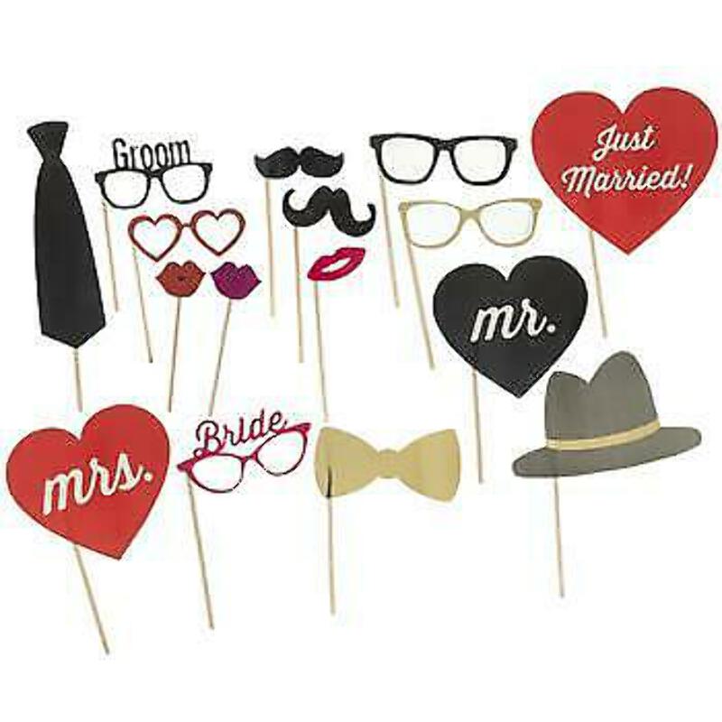 Customize your wedding reception with a fun and simple photo booth! Wedding Photo Props includes unique pieces attached to sticks for quick and easy photographic moments. Complete with phrases, glasses, bride and groom labels, and more, these photo props will add a touch of extra fun to your reception. Dimensions: Length: 7 3/4 - 12 5/8 Width: 2 3/4 - 9 1/8 Package contains 16 props.