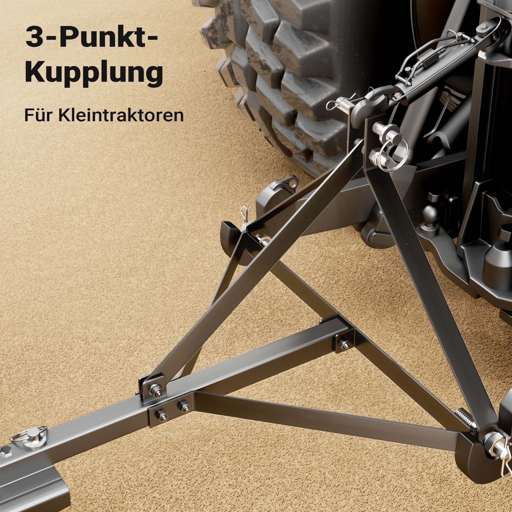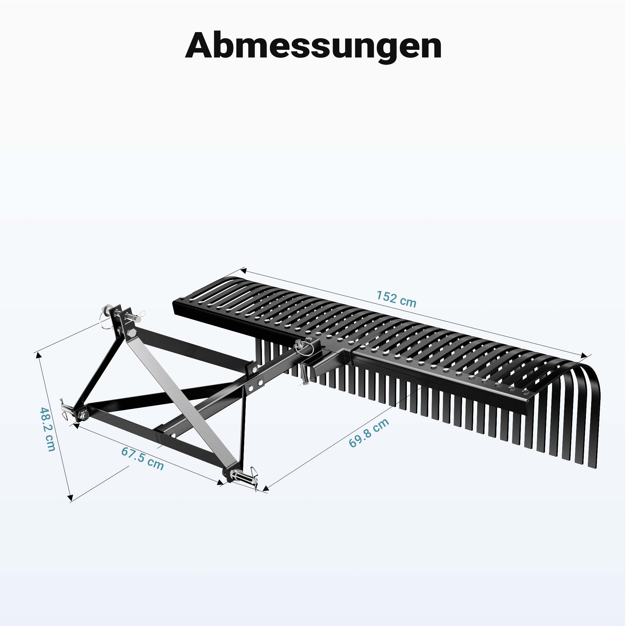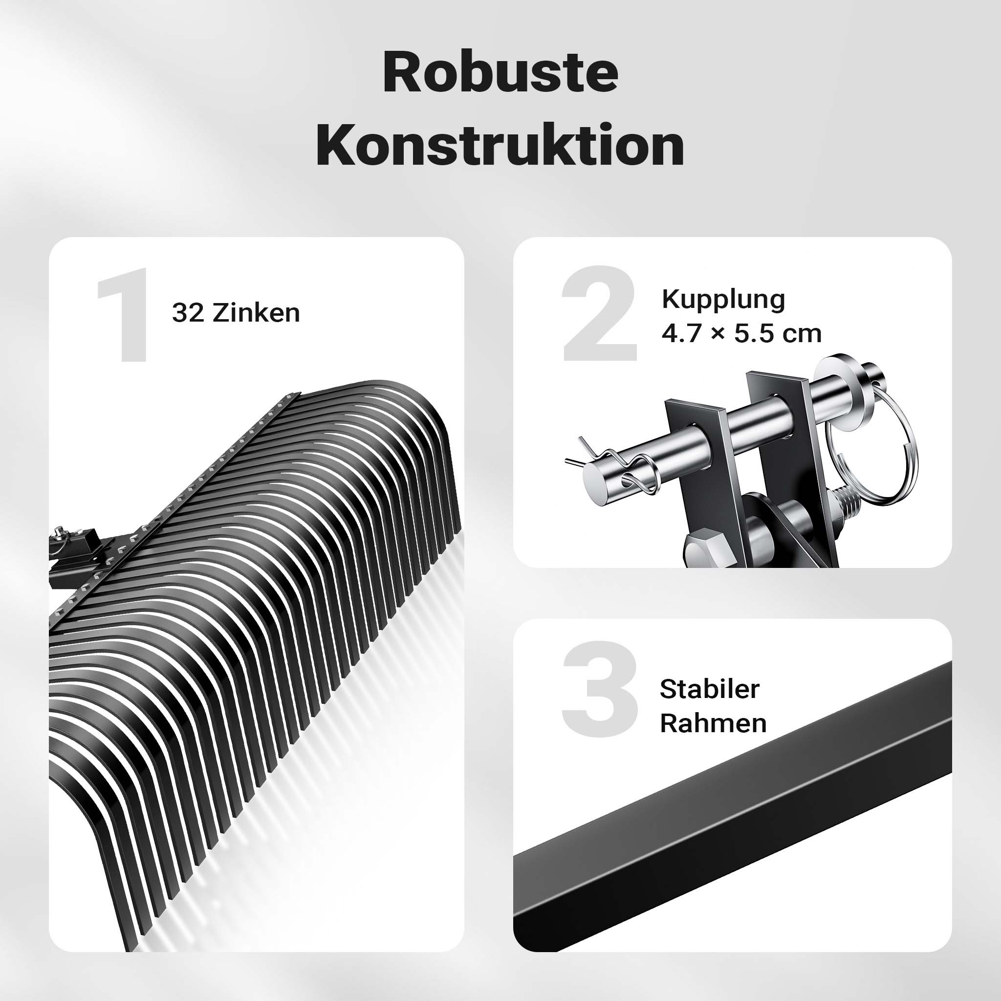 Il rastrello per mini trattore è dotato di un robusto perno di aggancio di 4,7 x 5,5 cm, ideale per un accoppiamento forte e sicuro. Questo perno garantisce che il rastrello sia ben fissato al trattore, permettendo un utilizzo sicuro anche nelle condizioni più difficili. Il telaio in materiale robusto assicura una distribuzione uniforme della forza, facilitando un'efficace lavorazione del terreno.